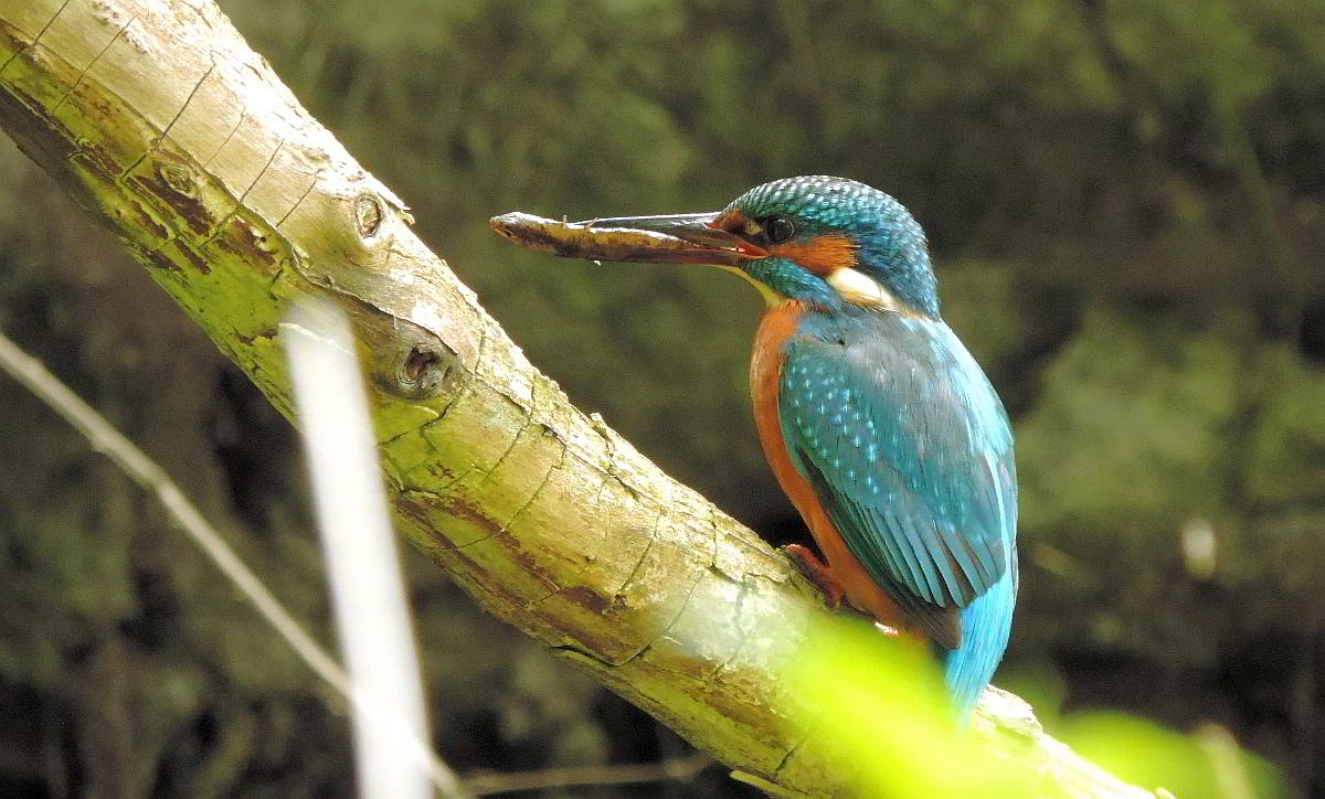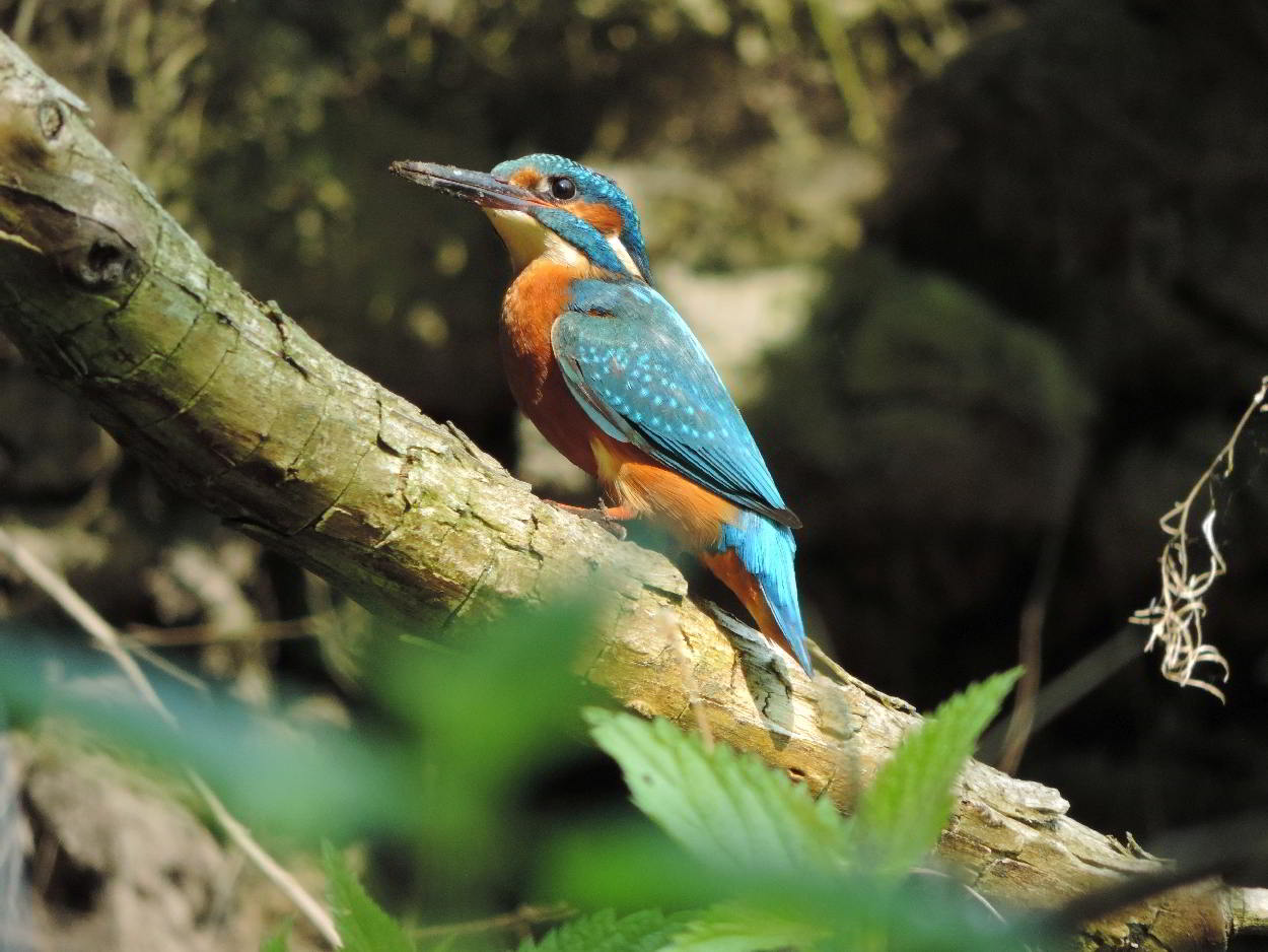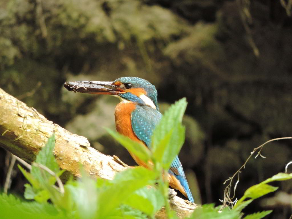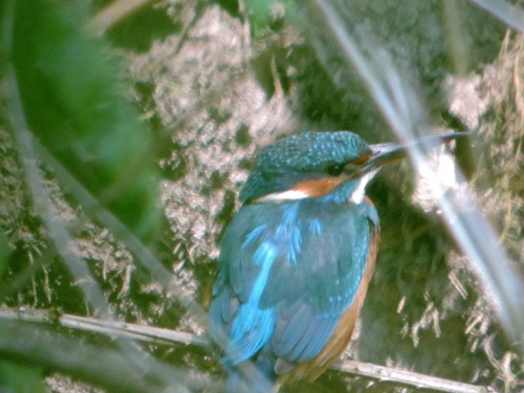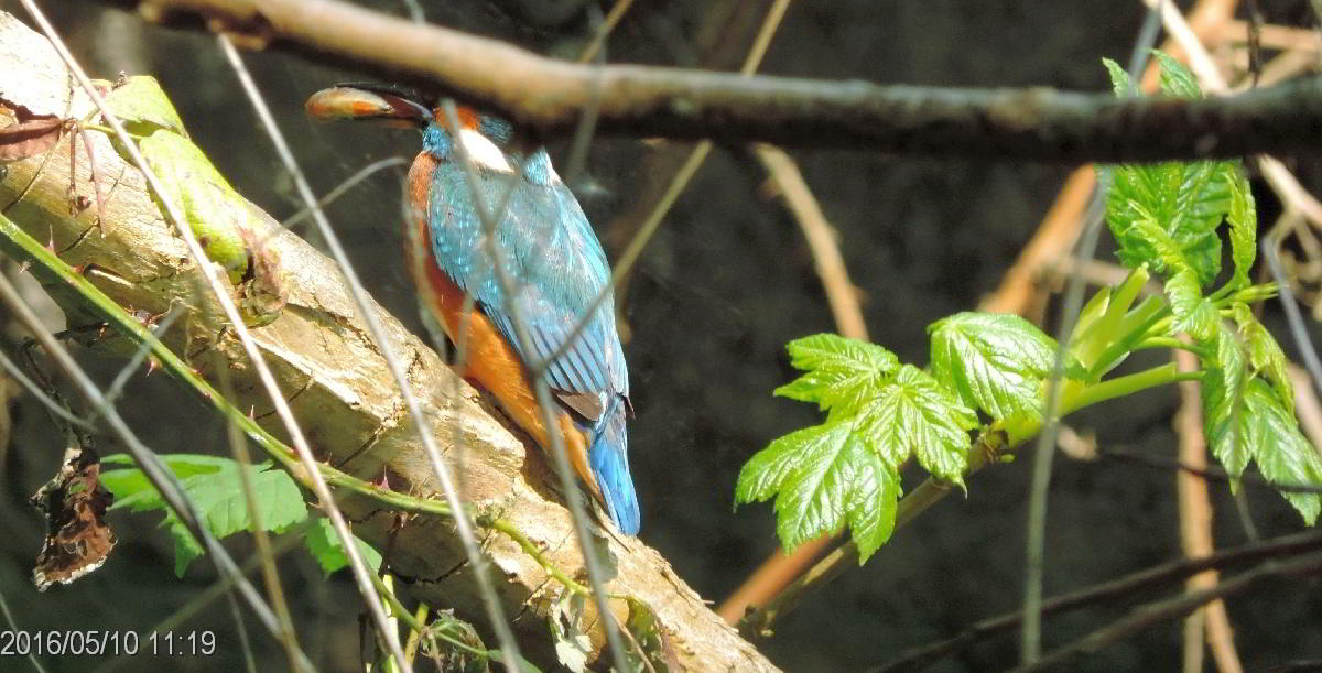 Und plötzlich höre ich wieder das vertraute zieh-zieh-zieh, nur viel schneller und nicht aus dem Nest, sondern hinter mir. Ich drehe mich um, um den Rufer zu suchen. Dabei verpasse ich den Abflug des anderen Eisvogels aus dem Nest. Beide flogen 50 bis 60 Meter bachaufwärts, landeten auf einem Zweig am Ufer, drehten sich sofort um und schauten zurück in meine Richtung. Klar, daß sie mich gesehen hatten. Das veranlaßte mich, volle Deckung hinter einer riesigen Weide mit mehreren Stämmen zu suchen und auf die Rückkehr zu warten. Das zog sich aber hin, und ich wollte schon den Heimweg antreten. Plötzlich sind beide Eisvögel wieder da, sitzen kaum 5 Meter vor mir lautlos vor der Niströhre und sichern eine zeitlang in alle Richtungen. Und ich schaue in Schockstarre zu. Dann geht alles ganz schnell. Er fliegt zum Nest und muß brüten. Sie fliegt den Bach hinab. Am Baumteller ist wieder Ruhe eingetreten. Und ich weiß jetzt, wann die Ablösung am Brutplatz erfolgt. |