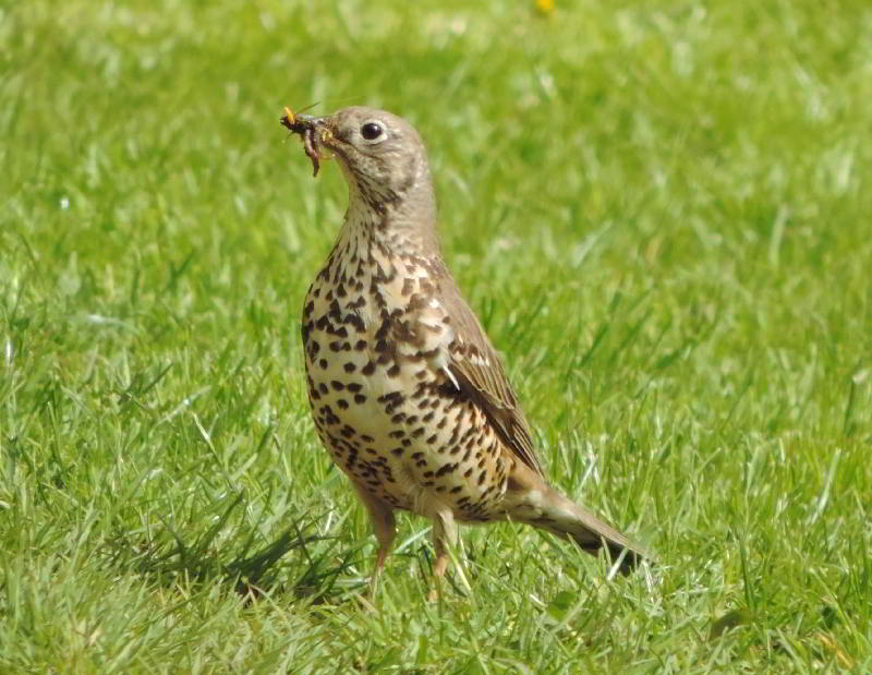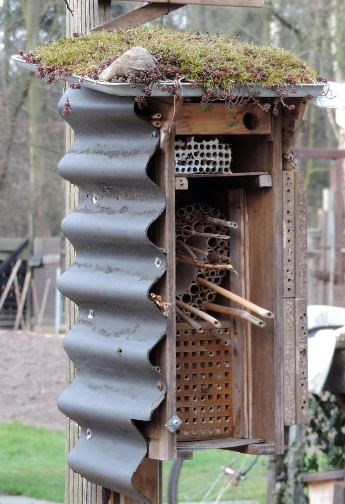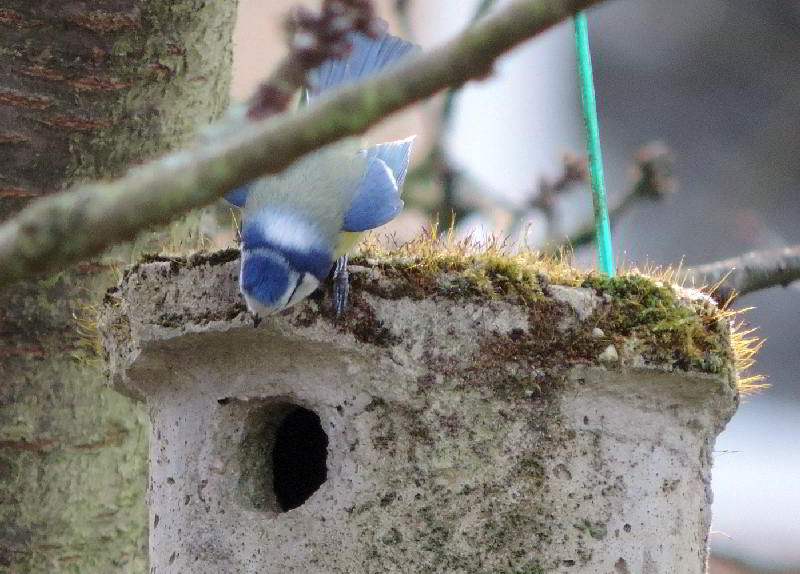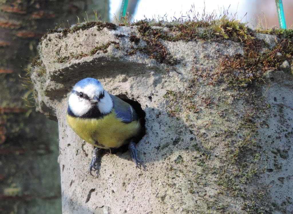 Do 05.05.2016, Vatertag! Auf der anderen Bachseite ist ein Wanderweg, von dem immer wieder das Gegröhle der Betrunkenen lautstark zu hören war. Viele Radfahrer und Wanderlustige waren ebenfalls unterwegs. Auf dem Rückweg besuchte ich meinen alten Gärtner, der schon über 40 Jahre einen 2000 qm großen Garten bewirtschaftet. Inzwischen ist er 86! Vor einigen Jahren konnte ich ihn überreden, einige meiner vielen gefundenen Nistkästen im Garten aufzuhängen. Vor ungefähr vier Jahren hatte ich ihm zwei kaputte Nistkästen gebracht. Weil es regnete, hatten wir sie nicht repariert, sondern als Halbhöhlen in eine Hecke und in eine seiner fliegenden Zeltbauten gesteckt. Mit voller Stolz geschwollener Brust berichtete er mir nun, daß in den Kasten unter der Plane immer mal ein Rotkehlchen fliegt. Ob die da brüten wollen?. Reinschauen ging nicht, aber ganz vorsichtig mit dem Finger reintasten müßte gehen. Und tatsächlich - ein Gelege. Sechs weitere Nistkästen sind mit Blau- und Kohlmeisen belegt. An den vielen Eigenbau-Futterhäuschen und dem selbstgebauten Insektenhotel herrscht Dauerbetrieb.