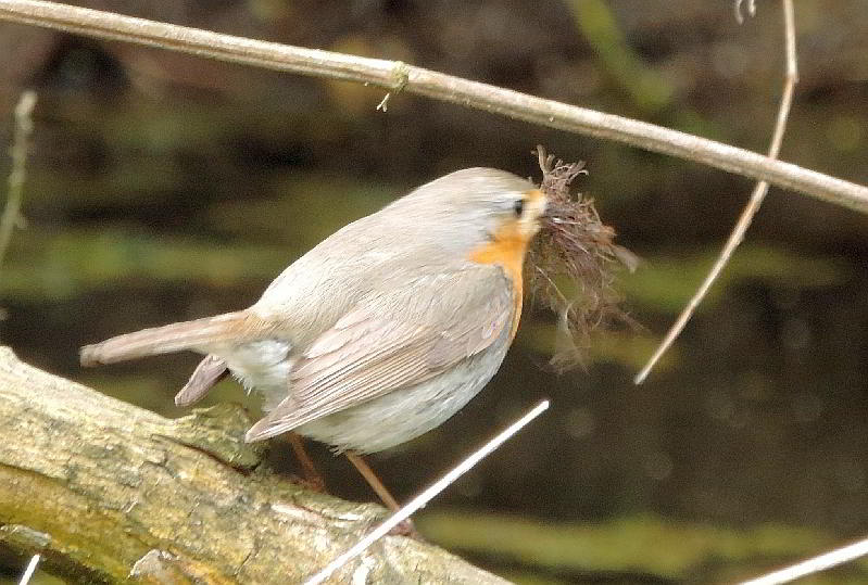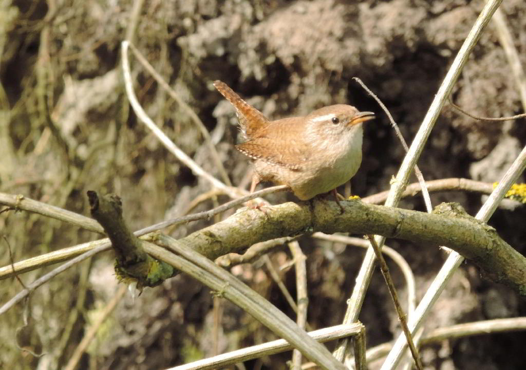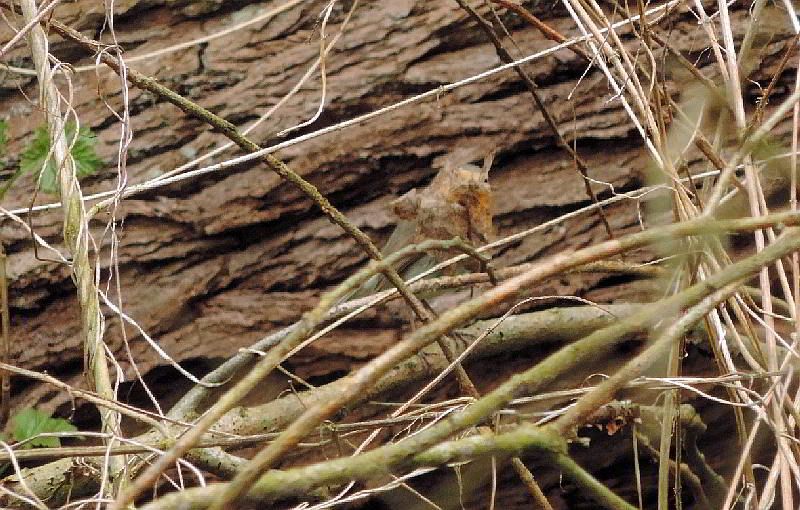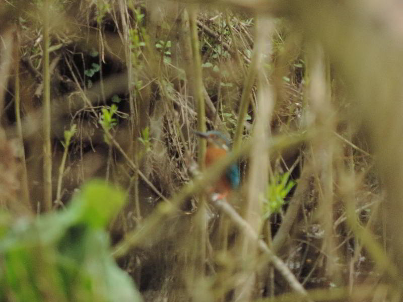 Dann streikte mein Akku. Und während ich den Akku wechselte, hörte ich ein bekanntes lautes zieh zieh zieh. Der Eisvogel flog rasant unmittelbar vor mir vorbei und landete nur 10 Meter weiter auf einem Zweig am nahen Bach. Und sofort tauchte er ab ins Wasser. Er kam ohne Beute aus dem Wasser, flog wieder auf den Zweig und fing an sich zu putzen. Ist ja klar! Auf der Rutschpartie aus der Röhre hat er sich ganz schön beschmiert und reinigte sich nun erst einmal mit einem Vollbad im Bach. Ein unscharfes Foto konnte ich gerade noch machen, dann war er auf und davon. Ein paar Fotos vom zutraulichen Zaunkönig:Noch 'ne Überraschung:An der linken Seite des Baumtellers gibt es unten noch ein Zaunkönignest. Und noch ein Brutvogel:Ein Rotkehlchen, daß nicht so zutraulich war wie der Zaunkönig, sich hinter gesammelten Laub versteckte und sehr vorsichtig war, schaute zu mir herüber. Mit Nistmaterial im Schnabel mußte es wohl auch in der Nähe sein Nest haben. Das gleiche Spielchen: Anflug gegen die Wand aus Erde und Wurzeln, und es war sofort verschwunden. Es hatte sein Nest ganz rechts im Baumteller. Auf 2 1/2 Meter waren 3 Nester und ein viertes auf der anderen Seite. Hinter mir, oben in einer abgebrochenen alten Weide, baute ein Kolmeisenpärchen sein Neist. Darunter lärmte ein Kleiber und am andern Ufer rief ein Zilpzalp ständig seinen Namen.