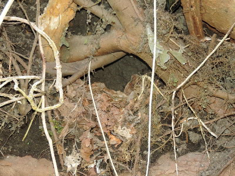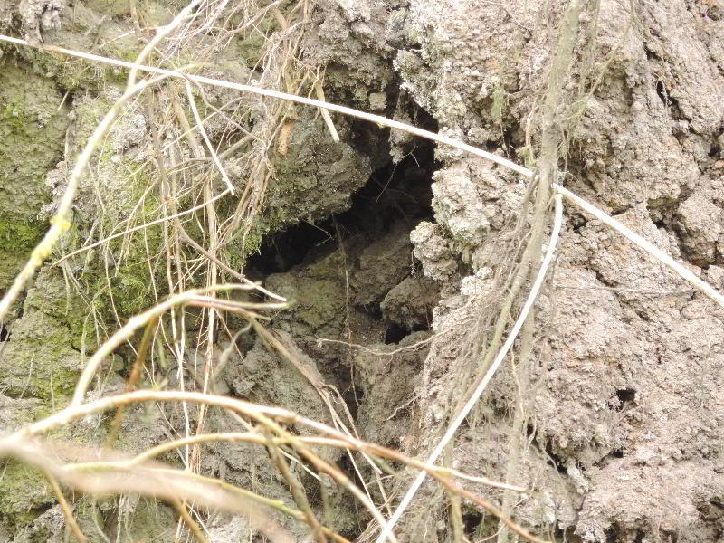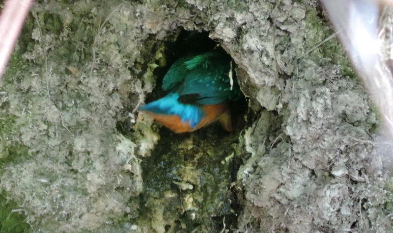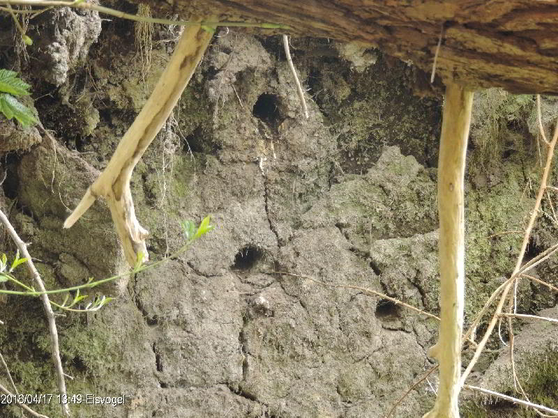 Ein Jahr später im Herbstfand ich Löcher im Baumteller, die wie angefangene Brutröhren aussahen. Vom Eisvogel war nichts zu hören und schon gar nichts zu sehen.. Ein weiteres Jahr war vergangen, und ich besuchte den Baumteller schon Anfang März. Eisvögel fangen schon zeitig im Jahr mit dem Brüten an. Vier Löcher gab es in der Wand. Beflogen schienen sie nicht zu sein. Eine Woche später entdeckte ich an einem Loch Kotspuren und feuchte Erde. Das sah ganz nach einer bewohnten Röhre aus. Nun ließ ich mir Zeit und suchte eine gute Deckung. Schließlich wollte ich nicht zum Neststörer werden. Es war eine Geduldsprobe. Als ich nach Stunden aufgeben wollte, flog ein roter blau glänzender Vogel im hohen Tempo an mir vorbei. Das war er. Er war in der Röhre. Am nächsten Tag:Als erstes fiel mir die Eisvogelrutschbahn in der Röhre auf. Matschige Erde und frischer nasser Kot sind zu erkennen. Auf dem Bauch rutschend schießt der Eisvogel aus der Röhre und ist sofort weg. Das dauert keine Sekunde, und die hat man schnell verpaßt! Ich auch. Aber nun gab es eine weitere Überraschung: