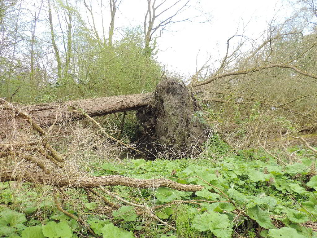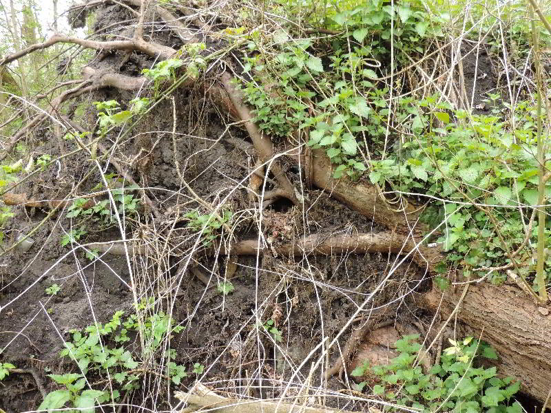 Ein Amselnest im BaumtellerWenn der Sturm einen Baum kippt, entsteht manchmal ein sogenannter Baumteller, vor allem dann, wenn der Baum ein Flachwurzler ist und der Boden feucht oder sogar sehr naß ist. Kommt noch Regen dazu, dann wird der Baum auch noch sehr schwer und kippt noch eher um. Rechts oben im Wurzelwerk des Baumtellers sieht man ein Loch, die dunkle Stelle. Dort hat eine Amsel ein Nest gebaut. Das Nest ist in Augenhöhe direkt an einem Trampelpfad. Als ich es entdeckte, waren 2 Eier im Nest. Eine Woche später waren es noch immer nur diese zwei Eier. Jeder Fußgänger geht nur 50 cm am Nest vorbei. Diese Neststörung ist von den Fußgängern nicht beabsichtigt. Es wird auch kaum jemand bemerkt haben. Der Amsel aber war das zuviel. Sie hat das Nest aufgegeben. Vielleicht ist sie ja beim nächsten Nest schlauer. Um es mit Darwin zu sagen: Wer sö dämlich sein Nest baut, kann sich nicht fortpflanzen. Es ist die natürliche Auslese der Natur.