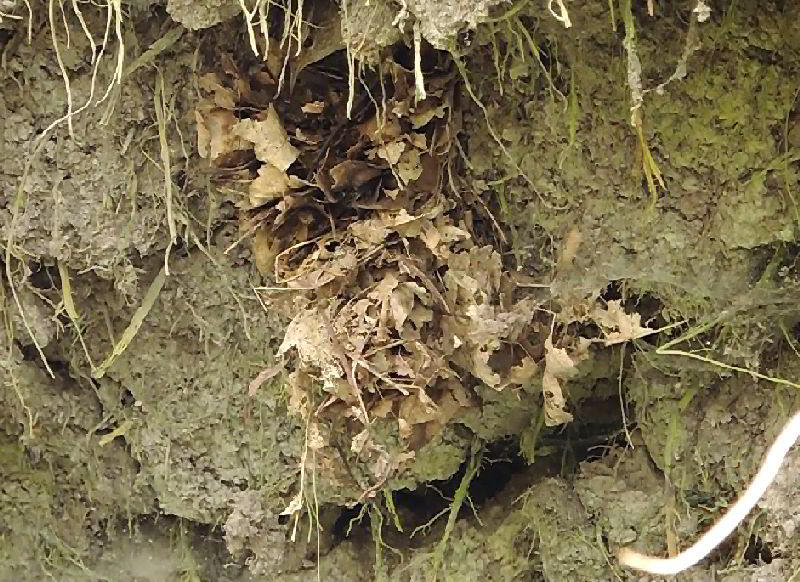 Knapp 1 Meter links vom Eisvogelloch hat eine Amsel mit frischen grünen Halmen und Moos in eine Niesche ein Nest gebaut. Leider habe ich sie nicht beim Nestbau beobachten können. Kein Wunder, denn sie hatte mit ihrem Nistplatz pech. Ein kleiner Erdklumpen fiel ins halbfertige Nest und beendete alle Aktivitäten. Schade.