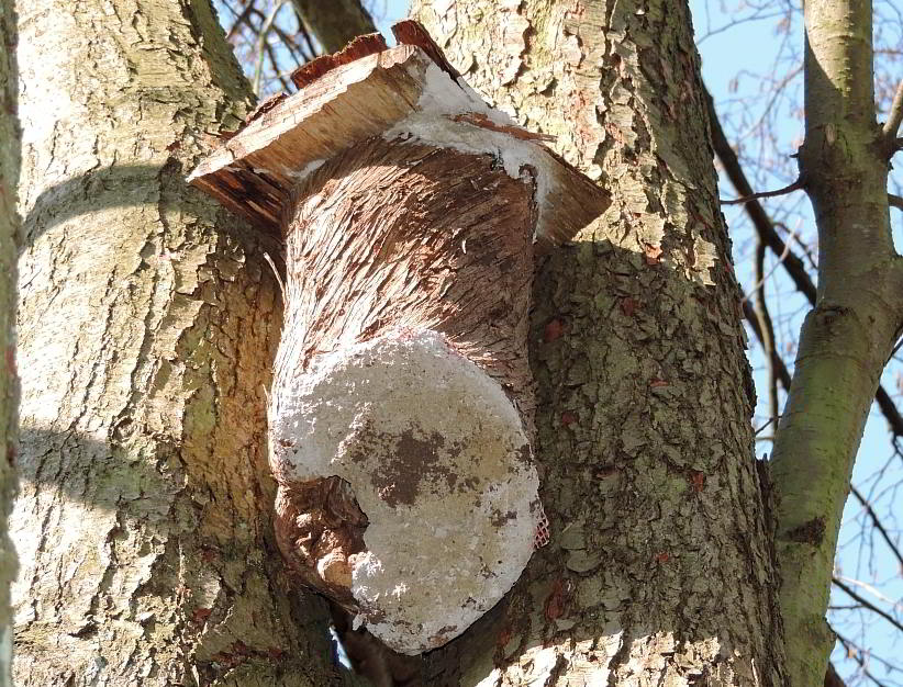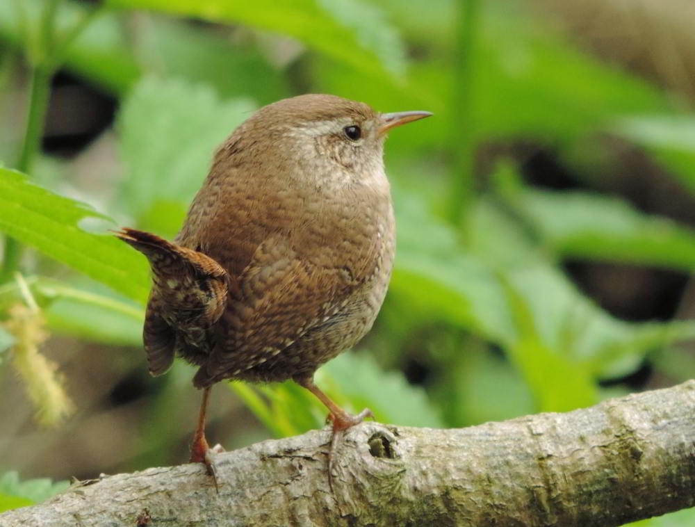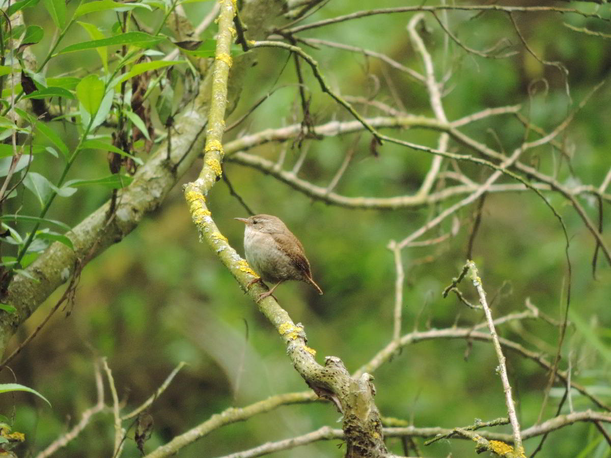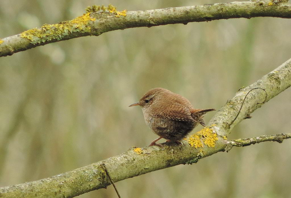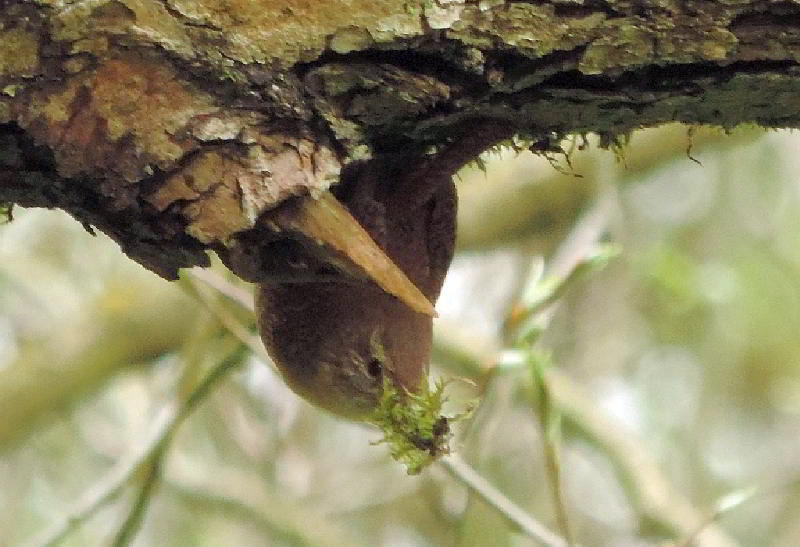 16.04.2016: Der Ast, an dem dieser Zaunkönig kopfüber Moos zupft, gehört zu einem Baumteller mit mehreren Nestern |